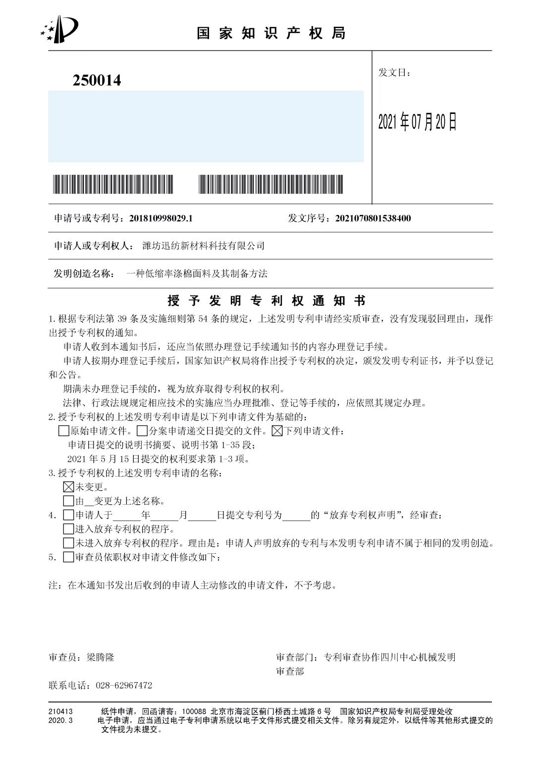 近日,國家知識產權局對濰坊迅紡新材料科技有限公司申請的“一種低縮率滌棉面料及其制備方法”作出授予發(fā)明專利權的決定,并頒發(fā)發(fā)明專利證書。