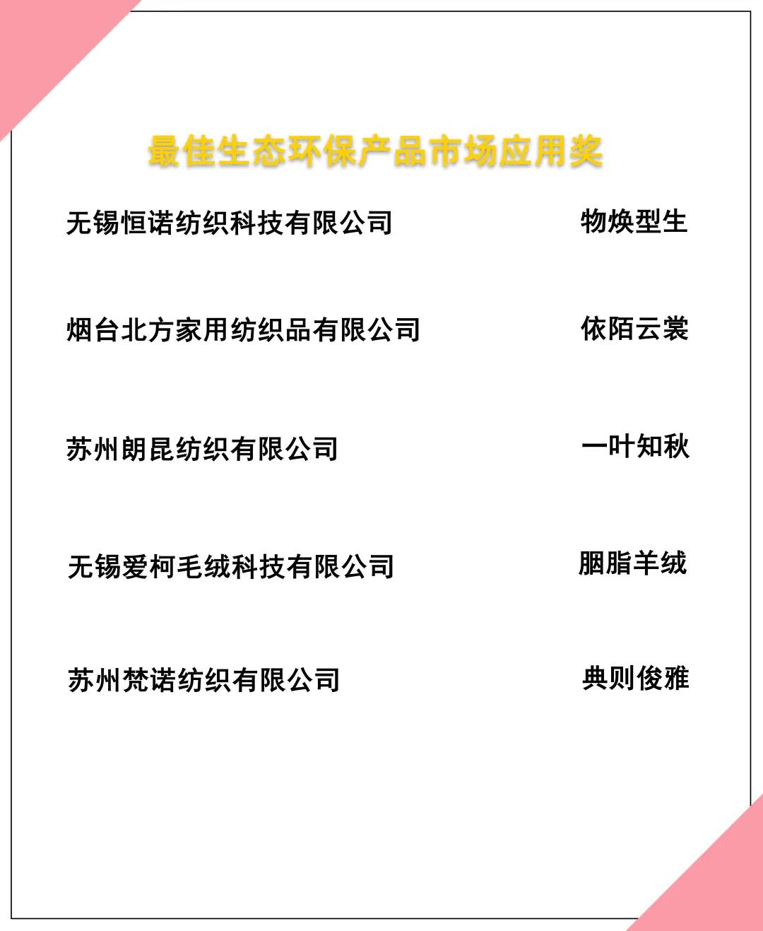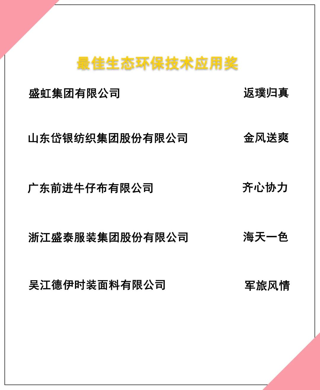 在綜合評(píng)審專家的評(píng)審意見及驗(yàn)證小組的線上驗(yàn)證評(píng)價(jià)基礎(chǔ)上,大賽最終評(píng)選出來自115家企業(yè)的187款優(yōu)秀面料,決出“最佳生態(tài)環(huán)保材料應(yīng)用獎(jiǎng)”、“最佳生態(tài)環(huán)保技術(shù)應(yīng)用獎(jiǎng)”及“最佳生態(tài)環(huán)保產(chǎn)品市場(chǎng)應(yīng)用獎(jiǎng)”三個(gè)單項(xiàng)大獎(jiǎng)。