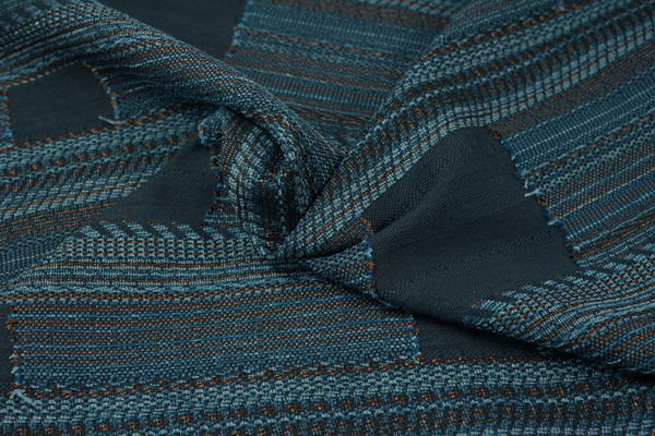 點(diǎn)評(píng):回歸手工藝術(shù)與民俗美學(xué),通過雪尼爾紗線的加入,結(jié)合剪花工藝和大提花組織結(jié)構(gòu)設(shè)計(jì),呈現(xiàn)夕陽(yáng)余波般的凹凸感手工編織紋理和創(chuàng)意拼補(bǔ)效果,展現(xiàn)懷舊節(jié)儉老土布風(fēng)格的升級(jí)再造。
