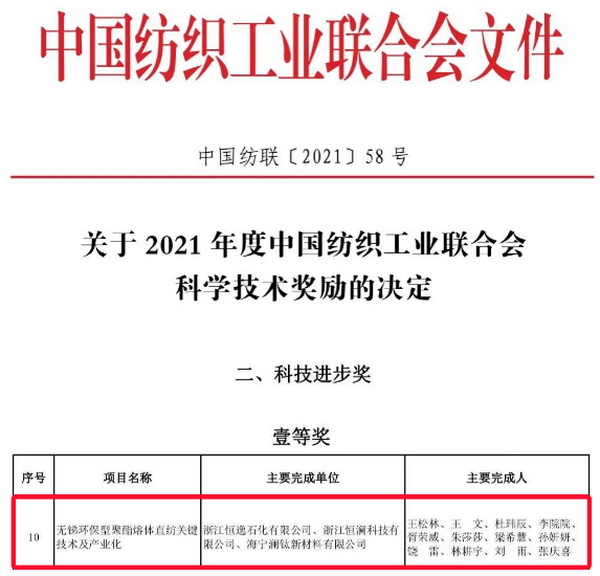 迄今為止,國內(nèi)外對(duì)無銻聚酯的色相控制一直是一個(gè)難點(diǎn),目前大多集中在瓶片和短纖的開發(fā)應(yīng)用。恒逸勇闖技術(shù)“無人區(qū)”,突破性解決大容量無銻環(huán)保聚酯熔體直紡長絲工藝及產(chǎn)品色相問題。恒逸《無銻環(huán)保型聚酯熔體直紡關(guān)鍵技術(shù)及產(chǎn)業(yè)化項(xiàng)目》榮獲2021年度中國紡織工業(yè)聯(lián)合會(huì)科技進(jìn)步獎(jiǎng)一等獎(jiǎng)。