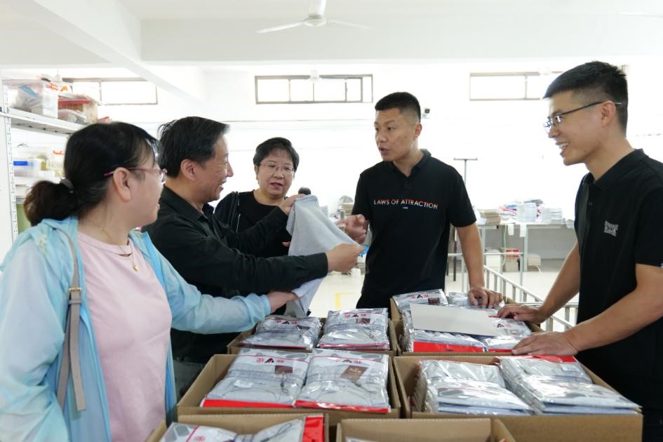 杜府服飾的杜占濤(右二)、杜占杰(右一)向邵光毅會長(左二)一行介紹產品