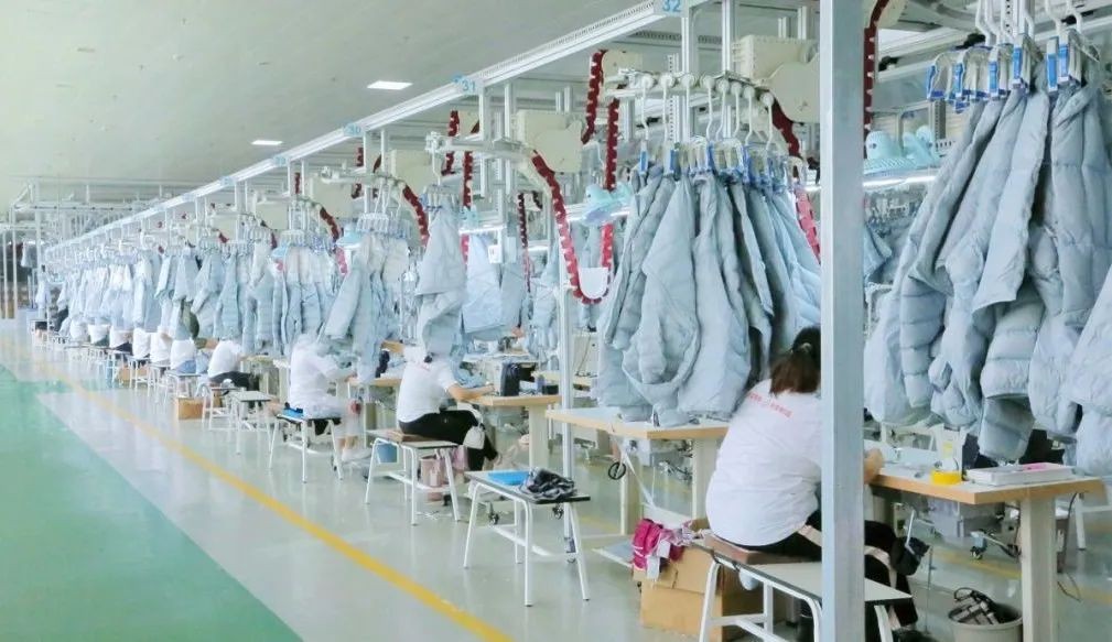 到了二樓,最重要的區(qū)域即為吊掛區(qū)。吊掛區(qū)采用分組制加工的形式,6條生產(chǎn)線即代表著6個(gè)生產(chǎn)小組。同時(shí),每條生產(chǎn)線上有20多名工人,這些工人又會(huì)分別負(fù)責(zé)不同的細(xì)分生產(chǎn)環(huán)節(jié),整條生產(chǎn)線包含了從裁片到羽絨服成衣的制作過(guò)程。