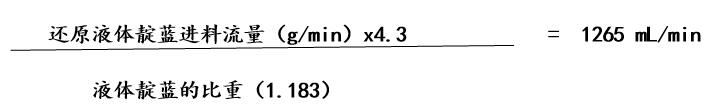 此部分扣除的燒堿等于本廠靛藍的進料流量(g/min)x4.3x6.03%;另外,1mL的38°Be的燒堿溶液中含有0.44g固體燒堿,所以折算成38°Be的燒堿溶液的體積數(shù)為本廠靛藍的進料流量g/min)x4.3x6.03%x0.44,即本廠靛藍的進料流量(g/min)x4.3x6.03%x2.27.