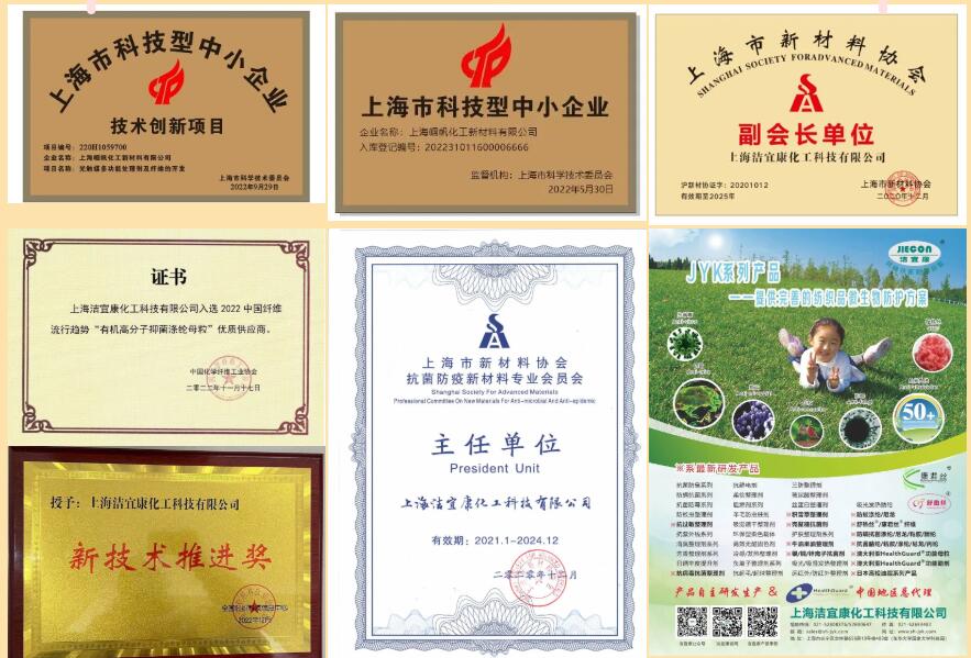 上海幗帆化工新材料有限公司一直專注于紡織品功能性纖維/紗線以及功能性添加劑和母粒等產(chǎn)品的自主研發(fā)與創(chuàng)新,技術(shù)創(chuàng)新能力與科研成果頻頻收獲政府、行業(yè)與客戶的認可。目前已榮獲“上海市科技型中小企業(yè)”、“上海市創(chuàng)新型中小企業(yè)”等諸多榮譽,并獲得上海市科技型中小企業(yè)技術(shù)創(chuàng)新項目的資助。目前公司在產(chǎn)品開發(fā)的同時,進行相關(guān)知識產(chǎn)權(quán)的申報,目前已經(jīng)申報國家發(fā)明專利和實用新型專利三十余項(偕同集團公司內(nèi)的上海潔宜康化工科技有限公司和上海翌璠工貿(mào)發(fā)展有限責任公司)。