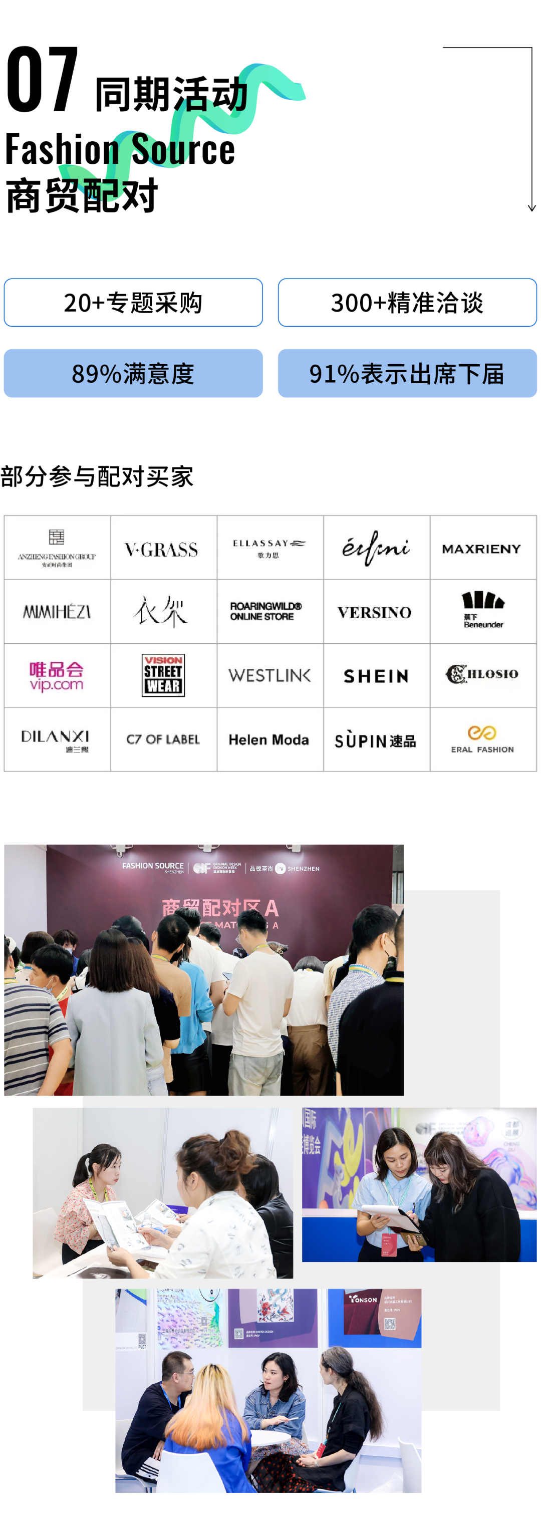 作為整合紡織服裝上下游優(yōu)質(zhì)資源的行業(yè)盛會,本屆春季展從展商、觀眾的數(shù)量/質(zhì)量/評價(jià),到商貿(mào)對接、現(xiàn)場活動(dòng)等方面的數(shù)據(jù)和現(xiàn)場效果,都交出了令人滿意的答卷,感謝每一位展商、觀眾的大力支持和熱情參與。9月20—22日,F(xiàn)ashion Source第27屆深圳國際服裝供應(yīng)鏈博覽會、SS2024深圳原創(chuàng)時(shí)裝周、Première Vision品銳至尚深圳展AW24-25將繼續(xù)在深圳國際會展中心(寶安)舉行,一場更大規(guī)模、更高規(guī)格的盛會即將到來,期待與您再次相聚!