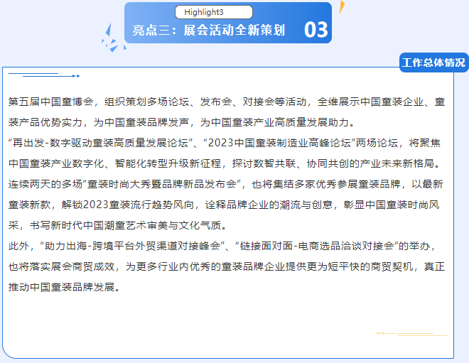 作為國(guó)內(nèi)最早專注于童裝產(chǎn)業(yè)的全產(chǎn)業(yè)鏈博覽會(huì),“童博會(huì)”以“童裝品牌·中國(guó)甄選”為核心,甄選中國(guó)童裝品牌,推動(dòng)及孵化中國(guó)優(yōu)秀童裝品牌,同時(shí)為中國(guó)家庭甄選更健康、時(shí)尚、優(yōu)質(zhì)的童裝產(chǎn)品,目前已經(jīng)成為國(guó)內(nèi)全產(chǎn)業(yè)覆蓋、全渠道覆蓋、全地域覆蓋的權(quán)威童裝產(chǎn)業(yè)專業(yè)博覽會(huì),真正推動(dòng)中國(guó)童裝品牌發(fā)展。