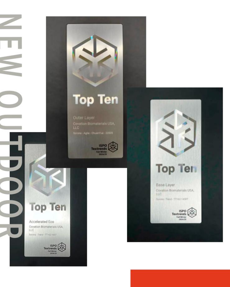 日前,SORONA®攜合作伙伴們榮獲三項2024春夏ISPO大獎和十六項2024/25秋冬ISPO大獎!「環(huán)保先鋒」、「全球十佳」、「全球精選」等大獎覆蓋了戶外面料的基礎(chǔ)層、中間層、外層、膜與涂層等。SORONA®為戶外運(yùn)動面料裝上創(chuàng)新加速器,性能賦能,觸感賦能,外觀賦能,展現(xiàn)黑科技戶外面料的最新前沿形態(tài)。