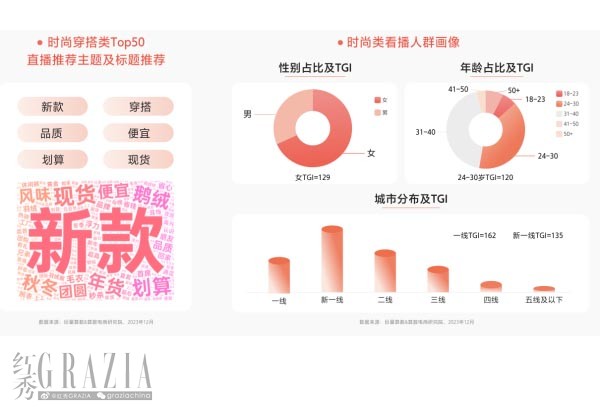 服飾作為瞬息萬(wàn)變的潮流品類,新品對(duì)生意增長(zhǎng)的重要性不言而喻。2023年“新款”成為直播推薦主題最多的關(guān)鍵詞,越來(lái)越多服飾品牌/商家選擇抖音作為新品首發(fā)陣地。這些時(shí)尚類直播尤其戳中24-30歲高線女性的“心巴”,成為她們的一手時(shí)尚源。