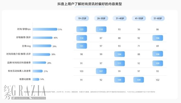 具體來(lái)看,“時(shí)尚/穿搭tips”類型的內(nèi)容因其普適性,受到了各年齡段用戶的廣泛歡迎,成為超過(guò)半數(shù)用戶偏好的內(nèi)容類型。對(duì)于19至25歲的年輕人而言,他們特別偏愛(ài)將時(shí)尚元素與日常情節(jié)相結(jié)合的vlog,這類內(nèi)容已成為他們的心頭好。而對(duì)于30歲以上的用戶群體,他們對(duì)豐富的視覺(jué)和情感體驗(yàn)更為敏感,更會(huì)認(rèn)真“做功課”。他們對(duì)知識(shí)性內(nèi)容有較高需求,同時(shí)也傾向于那些具有場(chǎng)景化劇情的內(nèi)容。