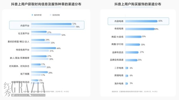 根據(jù)《報(bào)告》最新調(diào)研數(shù)據(jù),超七成消費(fèi)者傾向通過(guò)內(nèi)容平臺(tái)獲取時(shí)尚信息并選擇穿搭。以抖音為代表的內(nèi)容平臺(tái)由于天然的購(gòu)物心智,成為最受歡迎的購(gòu)置渠道。通過(guò)精準(zhǔn)興趣推薦和內(nèi)容展示,抖音讓消費(fèi)者深度沉浸在時(shí)尚“夢(mèng)境”之中,極大地壓縮了消費(fèi)者的決策路徑,使得時(shí)髦精們實(shí)現(xiàn)即看即買的便捷體驗(yàn)。