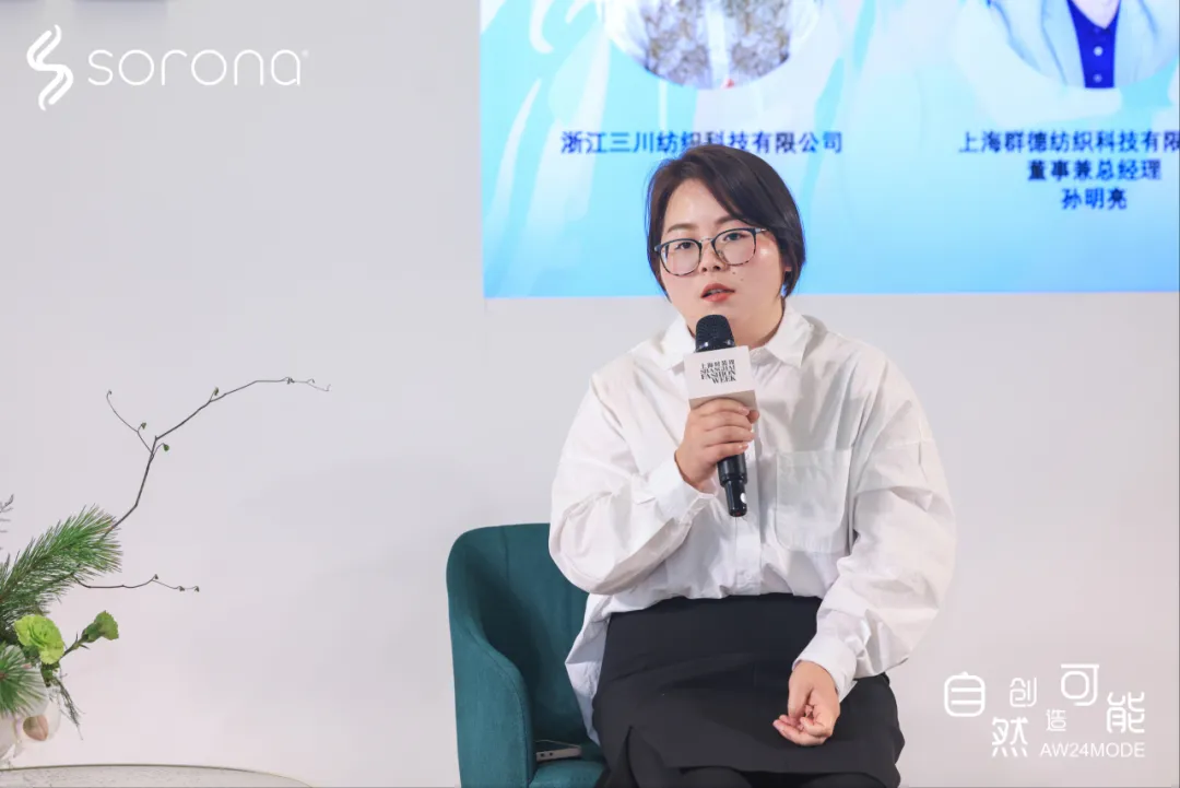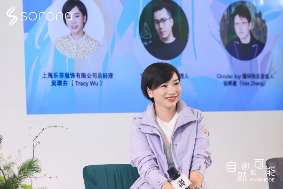 當(dāng)SORONA®為面料端帶來(lái)創(chuàng)意賦能的同時(shí),品牌端的應(yīng)用也為SORONA®生物基材料在終端市場(chǎng)增添了生命力和表現(xiàn)力。論壇上,作為SORONA®的合作品牌,上海樂(lè)菲服飾有限公司總經(jīng)理吳翠芬,TRICKCOO品牌主理人黃俊勛,Circular Joy 循環(huán)快樂(lè)發(fā)起人張曄崴三位嘉賓受邀上臺(tái),在SORONA®大中華區(qū)市場(chǎng)經(jīng)理李克潔的主持引導(dǎo)下,從各自的角度,闡述他們?nèi)绾螐腟ORONA®生物基材料獲得創(chuàng)意靈感,又是如何以創(chuàng)新設(shè)計(jì),賦予SORONA®以更多時(shí)尚與藝術(shù)內(nèi)涵。
