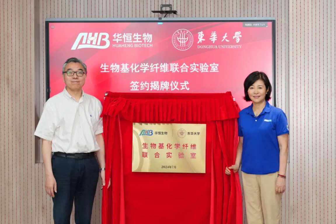 華恒生物董事長兼總裁郭恒華與東華大學(xué)研究院副院長、高性能纖維及制品教育部重點(diǎn)實驗室主任王華平教授共同為聯(lián)合實驗室揭牌