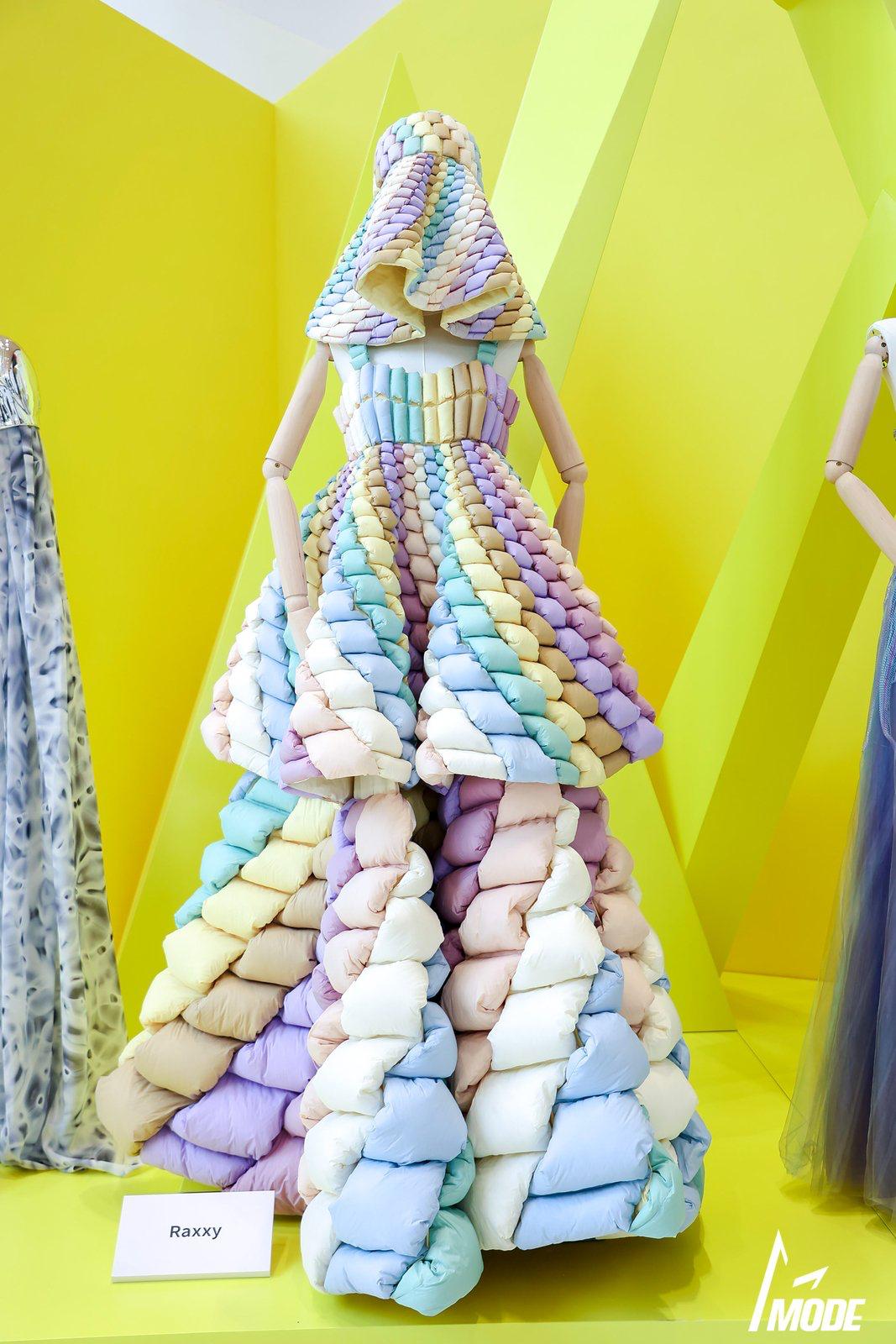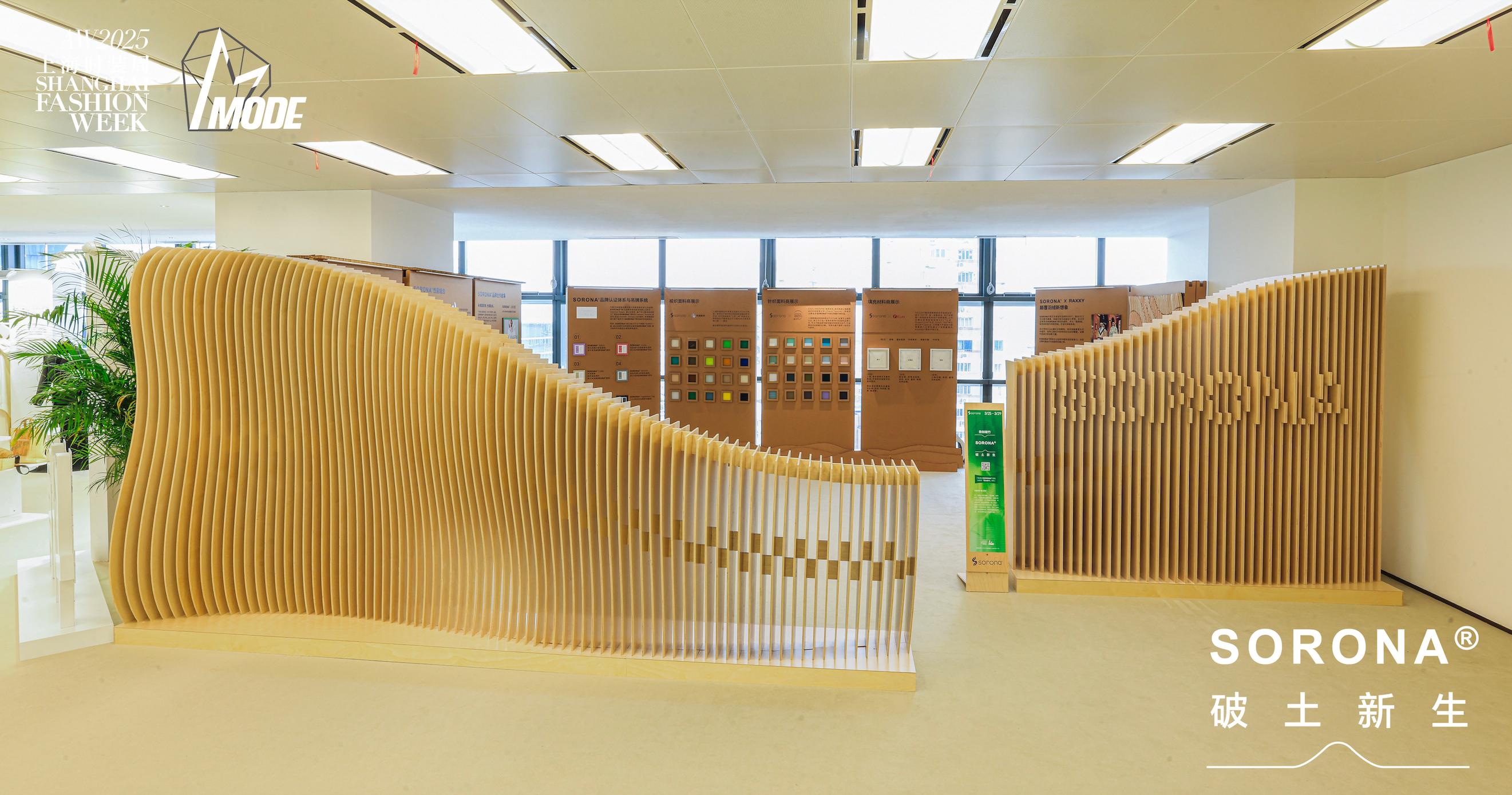 竹海中,SORONA®聚合物的生產(chǎn)過程、性能組合、品牌認(rèn)證體系與吊牌系列等信息依序展示,SORONA®與傳越新材、群德紡織、自然化纖三位材料端合作伙伴,以及與高級時裝羽絨品牌RAXXY的創(chuàng)意聯(lián)創(chuàng),也展現(xiàn)了從原材料的甄選、到織物的塑形、再到設(shè)計師筆下的靈感躍動,每一道工序如竹節(jié)般承前啟后、遞進蛻變的產(chǎn)業(yè)鏈進階生態(tài)。SORONA®為品牌客戶提供的一站式應(yīng)用技術(shù)解決方案的“成熟態(tài)”,也就此落地有聲,如「破竹之勢」,開啟從自然生長到共生未來的非凡旅程。而這段旅程在本屆MODE展的起點,或許從1樓入口處設(shè)計師集合展示區(qū)展示的RAXXY品牌令人一眼驚艷的作品,就已經(jīng)開始。