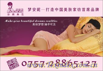 廣東佛山市夢安妮寢飾有限公司(前身為廣東金兔床品廠),始成立于1978年,是一家擁有近30年發(fā)展歷史的專業(yè)家紡產(chǎn)品企業(yè),產(chǎn)品范圍函蓋豪華套件、單件組合、被子、枕芯、靠墊、床墊護(hù)墊、毛浴巾、家居服飾、蓋毯休閑毯、夏令用品等10大類共300多個品種。 公司經(jīng)過近30年的艱苦創(chuàng)業(yè),一路穩(wěn)健經(jīng)營,力抓品質(zhì)和生產(chǎn),目前已經(jīng)成為具備一定知名度和美譽(yù)度的家紡企業(yè)。 在創(chuàng)業(yè)的過程中,我們逐漸形成了“誠信、創(chuàng)新、進(jìn)取”的企業(yè)文化,并為著實(shí)現(xiàn)“打造中國首席美膚家紡品牌”的目標(biāo)而不懈努力著。 公司為致力于打造“健康、舒適、時尚”的家居環(huán)境,不斷改進(jìn)生產(chǎn)工藝和引進(jìn)先進(jìn)的生產(chǎn)設(shè)備,開創(chuàng)了“順德絲綿被”之先河,榮獲 “佛山市順德質(zhì)量放心企業(yè)”稱號。夢安妮產(chǎn)品以其引領(lǐng)潮流的設(shè)計理念、精湛的工藝和卓越的品質(zhì),而深受廣大消費(fèi)者鐘愛,在家紡業(yè)界獨(dú)樹一幟。 我們秉承著“讓床上用品帶給國人的不僅僅是溫暖,更是健康”的使命,全體員工忠誠合作、互相尊重、齊心協(xié)力,共同為開創(chuàng)公司更加輝煌燦爛的美好明天而時刻奮斗著!