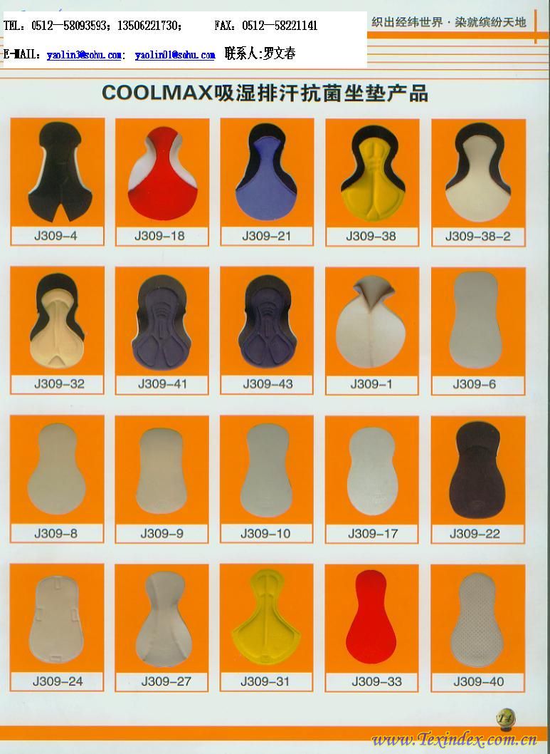 主料有:COOLMAX(杜邦吸濕排汗紗)+德國(guó)克萊恩公司的抗菌劑處理.分別有1—4片;用于單車褲襠襯用.厚度3—13MM;價(jià)格:2.1—10.5元/只不等.
