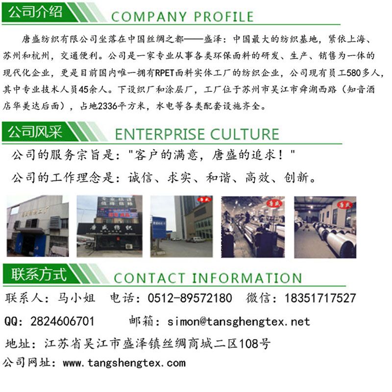 后整理:染色、印花、三防(防水,防污,防油)、壓花、壓皺、涂金/銀/白、防紫外線、阻燃、PU、PVC壓延(新老歐標(biāo))、TPE背膠、TPU復(fù)合、優(yōu)力膠等