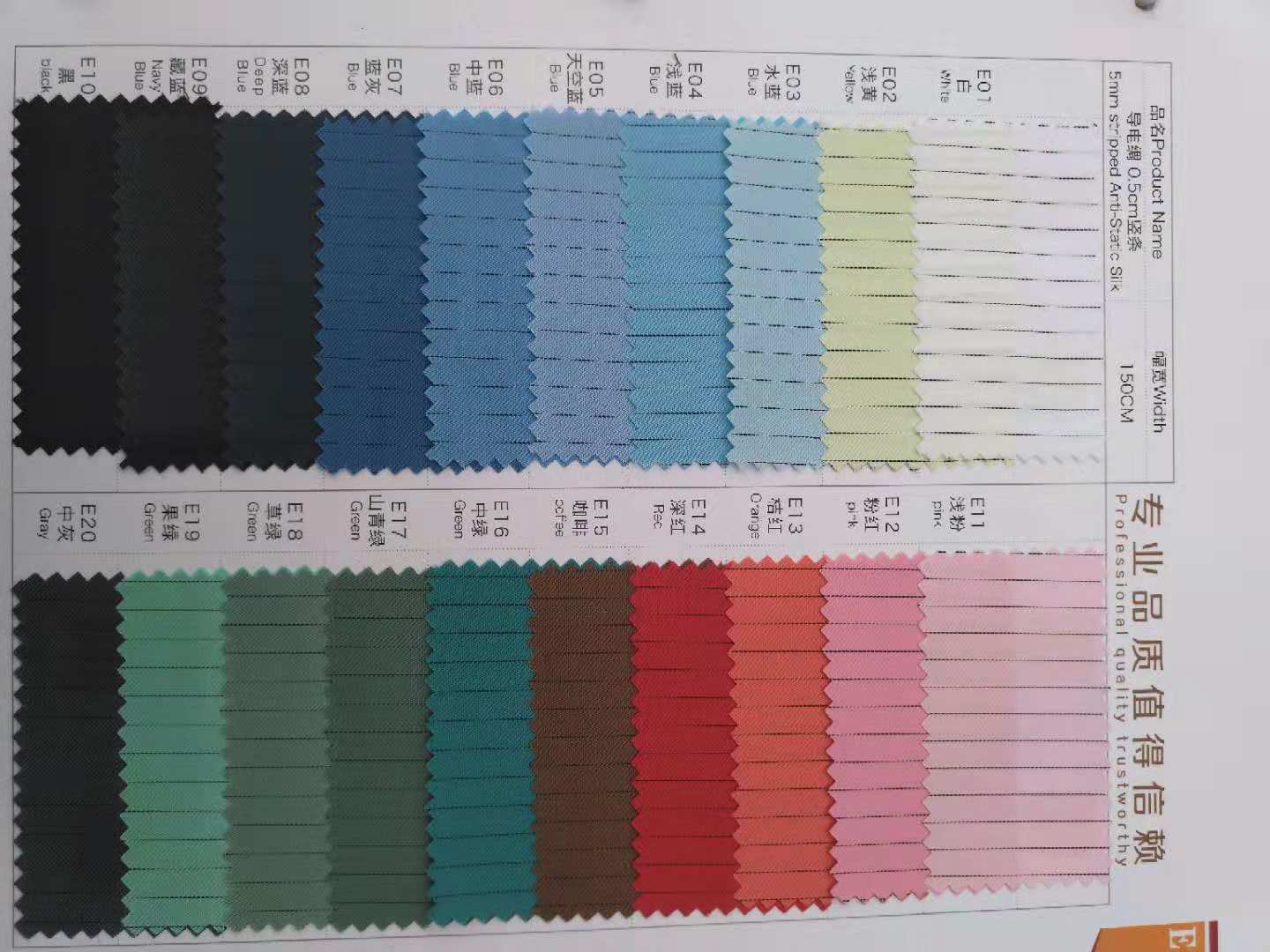 產(chǎn)品有防靜電系列,防輻射系列,阻燃系列,防酸堿系列,防油拒水系列,防紫外線系列等。同時還可以提供涂層,復(fù)合,軋光軋字,植絨等后處理工藝。產(chǎn)品深受國內(nèi)外廣大用戶的歡迎,所生產(chǎn)的功能性織物經(jīng)國家勞動保護(hù)用品監(jiān)督檢驗(yàn)中心,SGS等權(quán)威部門檢測,其性能符合國內(nèi),國際標(biāo)準(zhǔn)。