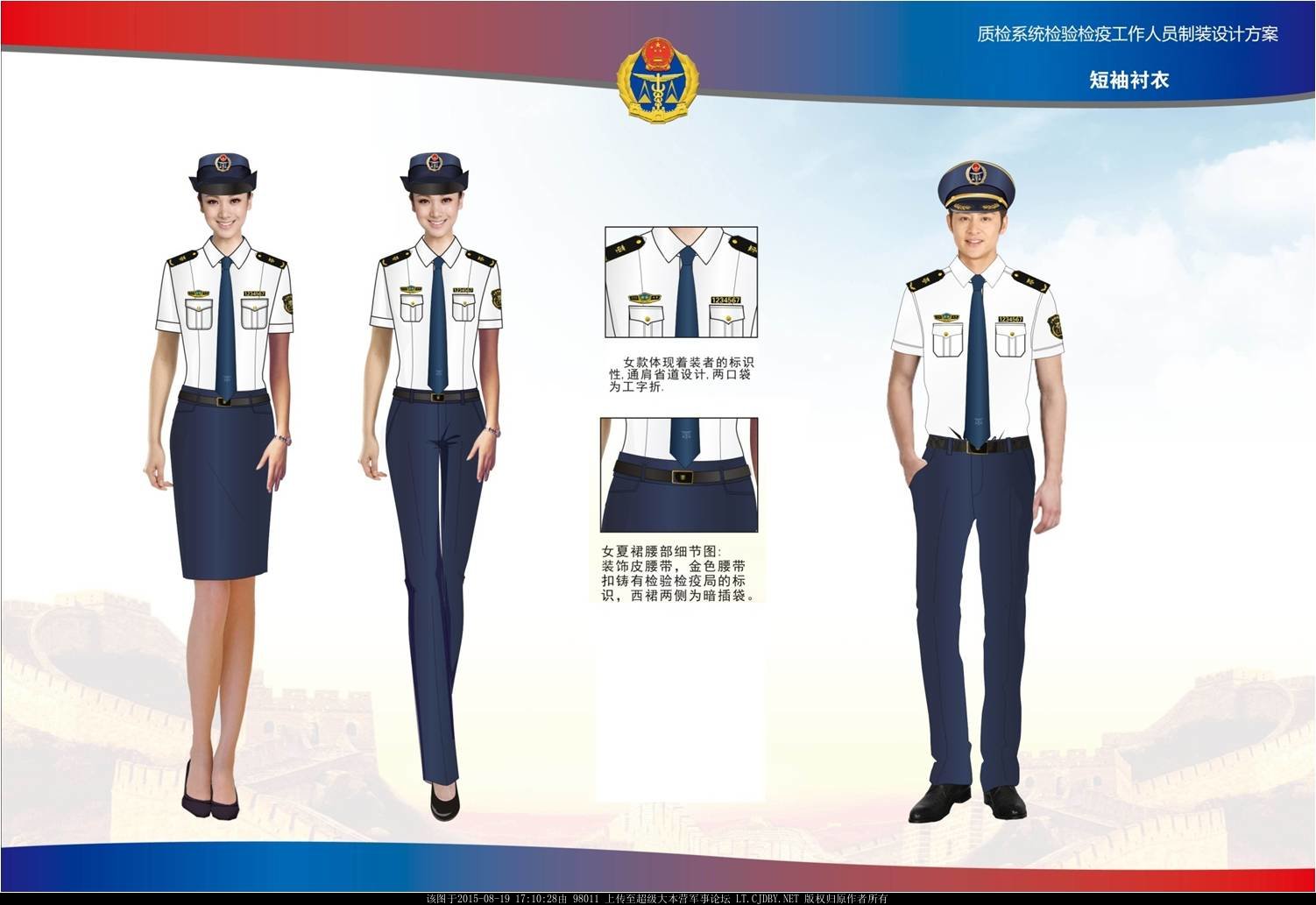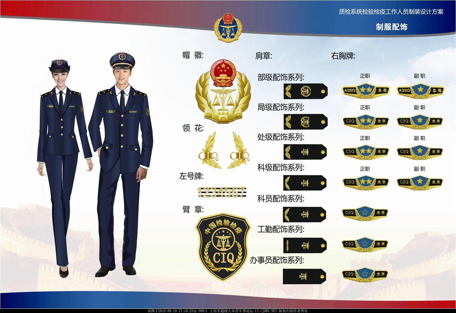 檢驗(yàn)檢疫標(biāo)志服配裝:包括春秋常服、夏常服、冬常服、多功能服。配套制式服裝包括制式農(nóng)業(yè)標(biāo)志服羊毛衫、農(nóng)業(yè)標(biāo)志服皮鞋、農(nóng)業(yè)標(biāo)志服帽子、農(nóng)業(yè)志服腰帶。標(biāo)志有臂章、肩牌、肩花、檢驗(yàn)檢疫標(biāo)志服帽徽、檢驗(yàn)檢疫標(biāo)志服胸牌、胸號(hào)、領(lǐng)花、領(lǐng)帶、領(lǐng)帶夾。