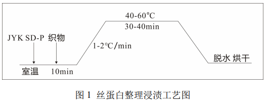 織物前處理→浸軋絲蛋白整理溶液(軋液率 60-100%)→烘干(80-120℃) →拉幅定型(140℃,30s)。