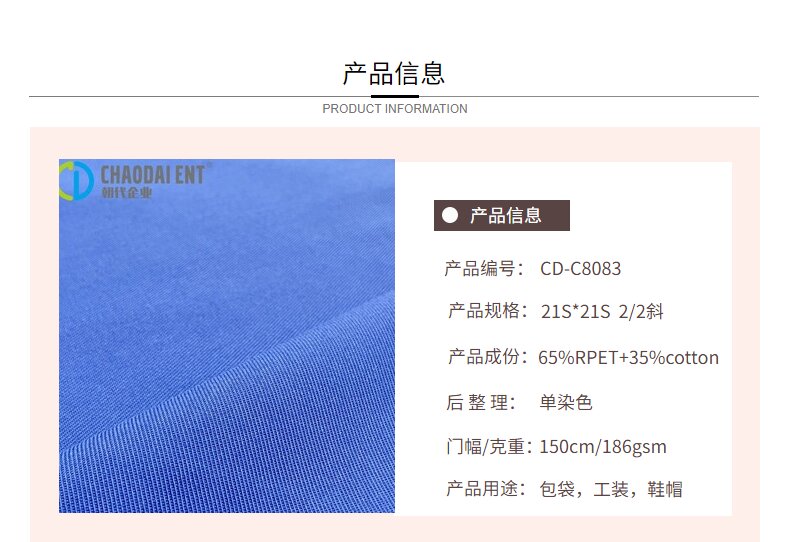 關(guān)鍵字:再生面料,2/2斜帆布面料,工裝面料,鞋帽面料