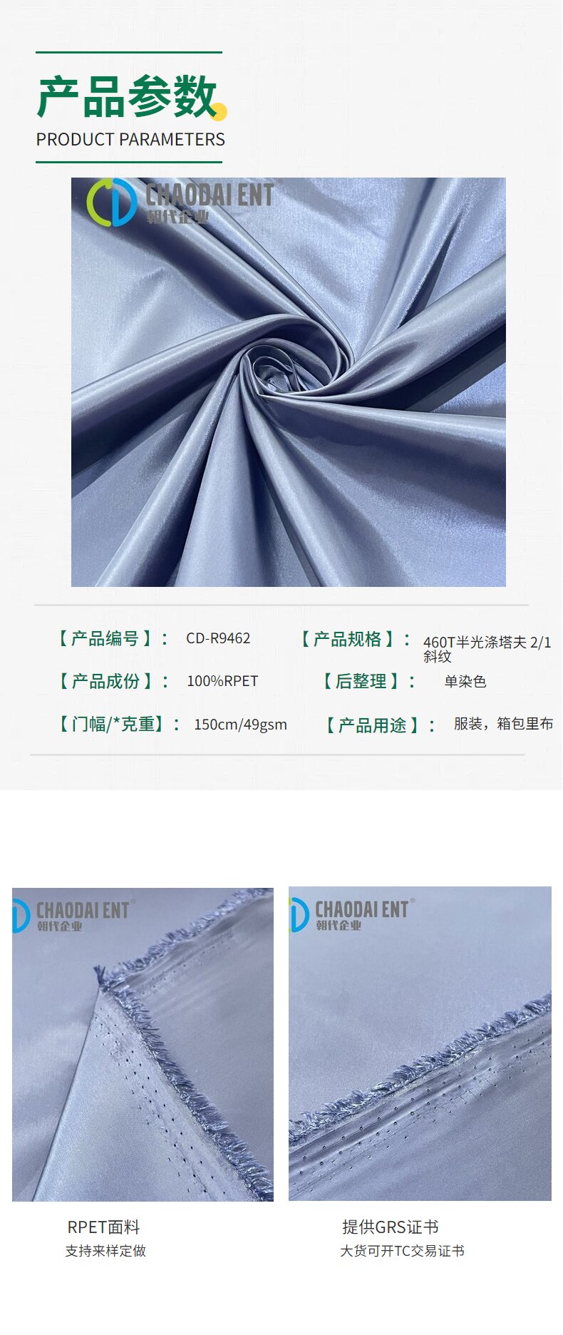 關(guān)鍵字:再生面料,半光滌塔夫面料,箱包面料,服裝面料,里布面料