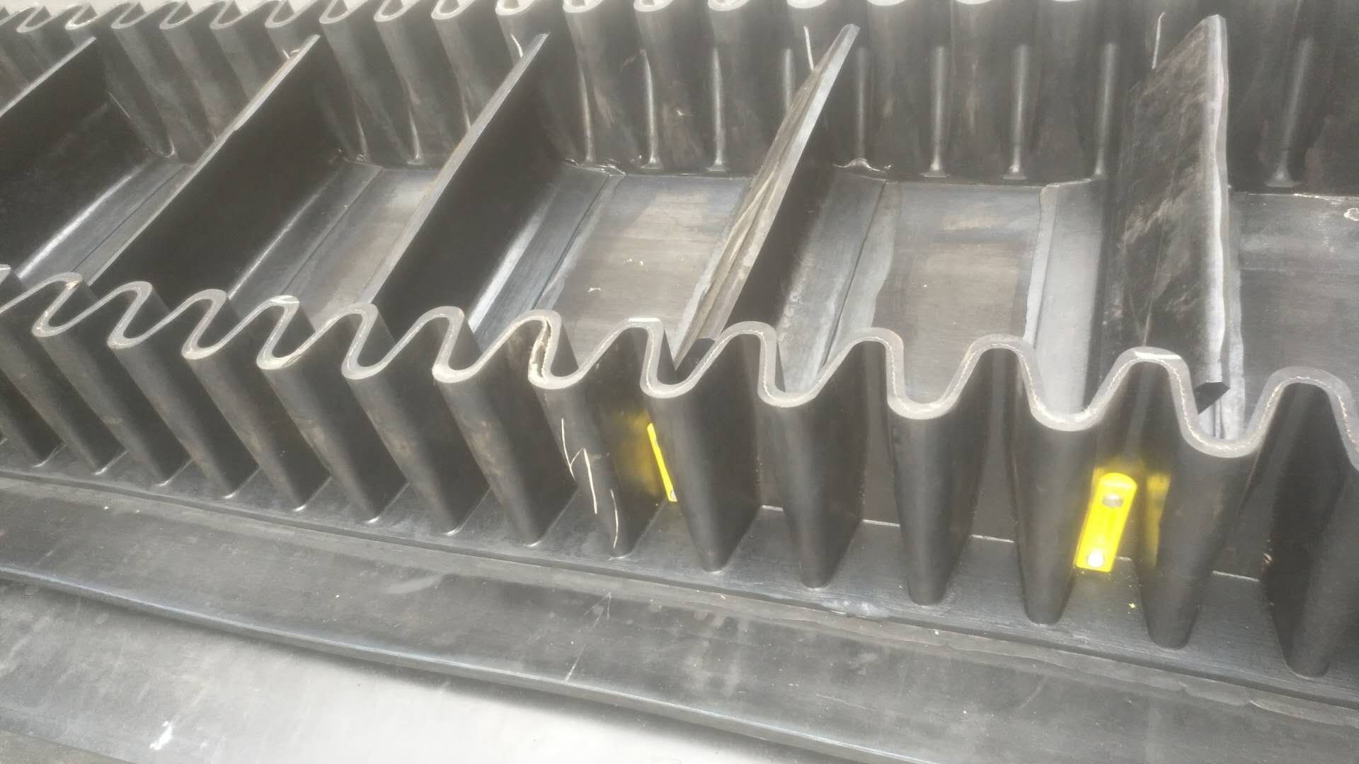 大傾角波狀環(huán)形帶又叫裙邊隔板輸送帶, 是由基帶、擋邊、橫隔板3部分組成。擋邊起防止物料測滑撒落的作用。為便于繞過滾筒,檔邊設計成波紋狀;橫隔板的作用是承托物料,為了實現(xiàn)大傾角輸送,采用T型TC型。檔邊和橫隔板是用二次硫化的方法與基帶連接的,具有很高的連接強度。用于輸送易散落的粉狀、粒狀、小塊狀、糊狀及液態(tài)狀物料。其特點:適用于傾角0°~90°散裝物料的輸送;具有使用范圍廣、占地面積小、無轉運點、減少土建投資、維護費用低、維修容易輸送量大 連續(xù)化、高效率、大傾角運輸,操作安全,使用簡便,,運費低廉,并能縮短運輸距離,降低工程造價,節(jié)省人力物力等特點;解決了普通帶和花紋帶所不能達到的輸送角度;還可根據(jù)使用環(huán)境,設計成完整、獨立的輸送系統(tǒng),避免了間斷輸送和復雜輸送的提升系統(tǒng)??裳厮?、傾斜、垂直和變角方向輸送各種散裝物料,從煤、礦石、沙子到化肥和糧食等。物料粒度不限,可從很小的粒度到400mm的大粒度,輸送量可從1立方米/小時到6000立方米/小時。