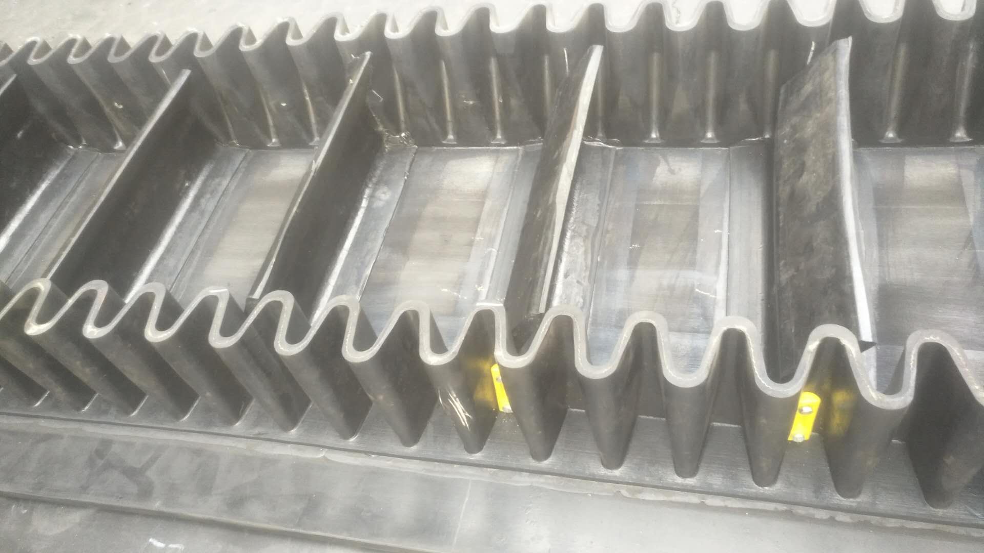 大傾角波狀擋邊輸送帶又叫裙邊隔板輸送帶, 是由基帶、擋邊、橫隔板3部分組成。擋邊起防止物料測滑撒落的作用。為便于繞過滾筒,檔邊設(shè)計成波紋狀;橫隔板的作用是承托物料,為了實現(xiàn)大傾角輸送,采用T型TC型。檔邊和橫隔板是用二次硫化的方法與基帶連接的,具有很高的連接強度。用于輸送易散落的粉狀、粒狀、小塊狀、糊狀及液態(tài)狀物料。其特點:適用于傾角0°~90°散裝物料的輸送;具有使用范圍廣、占地面積小、無轉(zhuǎn)運點、減少土建投資、維護費用低、維修容易輸送量大 連續(xù)化、高效率、大傾角運輸,操作安全,使用簡便,,運費低廉,并能縮短運輸距離,降低工程造價,節(jié)省人力物力等特點;解決了普通帶和花紋帶所不能達到的輸送角度;還可根據(jù)使用環(huán)境,設(shè)計成完整、獨立的輸送系統(tǒng),避免了間斷輸送和復(fù)雜輸送的提升系統(tǒng)??裳厮?、傾斜、垂直和變角方向輸送各種散裝物料,從煤、礦石、沙子到化肥和糧食等。物料粒度不限,可從很小的粒度到400mm的大粒度,輸送量可從1立方米/小時到6000立方米/小時。