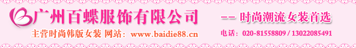 廣州百蝶服飾有限公司以韓版女裝批發(fā)為主要經(jīng)營模式,立足廣州面向全國的專業(yè)服裝生產(chǎn)批發(fā)經(jīng)銷商。長期以來與廣州、東莞等眾多服裝廠商及快遞公司有著良好的合作關(guān)系。在全國各地?fù)碛写罅康目蛻羧后w,得到廣大服裝批發(fā)零售商以及眾多代理商的一致好評,在女裝批發(fā)零售業(yè)界有著良好的口碑和信譽(yù)。
