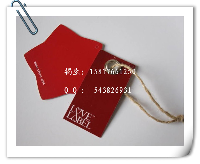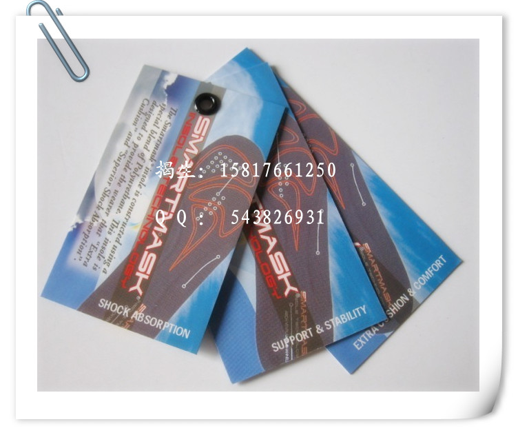 吊牌:吊牌(Tag 或Tagcard)的制作,按介質(zhì)分有紙制的、塑料的、金屬的;按形狀結(jié)構(gòu)分有長方形、對(duì)折形、圓形、三角形、插袋式以及其它特殊造型的;按功能分有普通型、條碼防偽型和全息防偽型等等