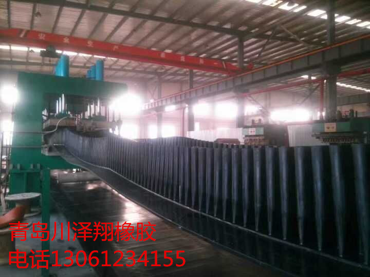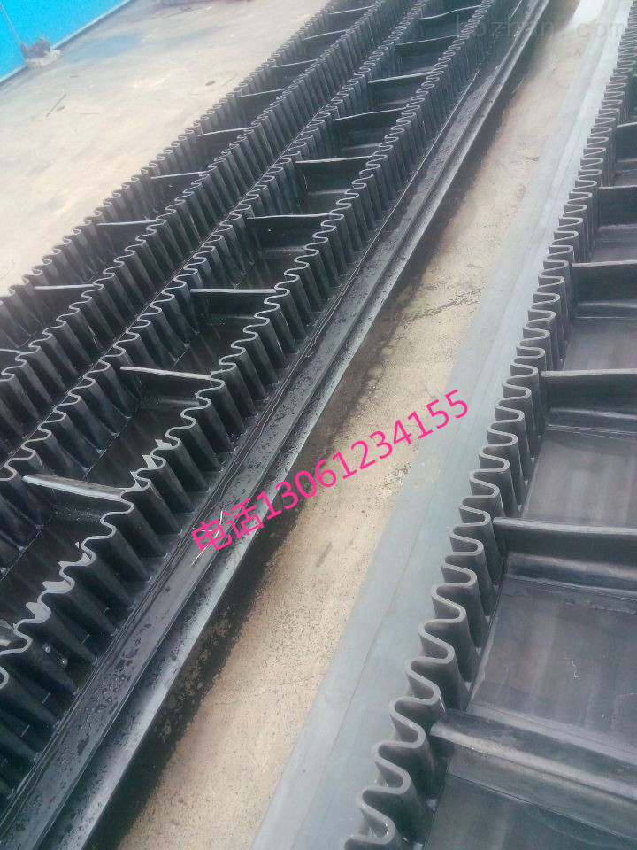 大傾角擋邊提升帶, 是由基帶、擋邊、橫隔板3部分組成。擋邊起防止物料測滑撒落的作用。為便于繞過滾筒,檔邊設計成波紋狀;橫隔板的作用是承托物料,為了實現(xiàn)大傾角輸送,采用T型TC型。檔邊和橫隔板是用二次硫化的方法與基帶連接的,具有很高的連接強度。用于輸送易散落的粉狀、粒狀、小塊狀、糊狀及液態(tài)狀物料。其特點:適用于傾角0°~90°散裝物料的輸送;具有使用范圍廣、占地面積小、無轉(zhuǎn)運點、減少土建投資、維護費用低、維修容易輸送量大連續(xù)化、高效率、大傾角運輸,操作安全,使用簡便,,運費低廉,并能縮短運輸距離,降低工程造價,節(jié)省人力物力等特點;解決了普通帶和花紋帶所不能達到的輸送角度;還可根據(jù)使用環(huán)境,設計成完整、獨立的輸送系統(tǒng),避免了間斷輸送和復雜輸送的提升系統(tǒng)??裳厮?、傾斜、垂直和變角方向輸送各種散裝物料,從煤、礦石、沙子到化肥和糧食等。物料粒度不限,可從很小的粒度到400mm的大粒度,輸送量可從1立方米/小時到6000立方米/小時。