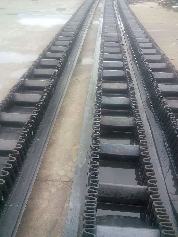 大傾角擋邊帶又叫裙邊隔板輸送帶, 是由基帶、擋邊、橫隔板3部分組成。擋邊起防止物料測滑撒落的作用。為便于繞過滾筒,檔邊設(shè)計成波紋狀;橫隔板的作用是承托物料,為了實現(xiàn)大傾角輸送,采用T型TC型。檔邊和橫隔板是用二次硫化的方法與基帶連接的,具有很高的連接強度。用于輸送易散落的粉狀、粒狀、小塊狀、糊狀及液態(tài)狀物料。其特點:適用于傾角0°~90°散裝物料的輸送;具有使用范圍廣、占地面積小、無轉(zhuǎn)運點、減少土建投資、維護費用低、維修容易輸送量大 連續(xù)化、高效率、大傾角運輸,操作安全,使用簡便,,運費低廉,并能縮短運輸距離,降低工程造價,節(jié)省人力物力等特點;解決了普通帶和花紋帶所不能達到的輸送角度;還可根據(jù)使用環(huán)境,設(shè)計成完整、獨立的輸送系統(tǒng),避免了間斷輸送和復(fù)雜輸送的提升系統(tǒng)??裳厮?、傾斜、垂直和變角方向輸送各種散裝物料,從煤、礦石、沙子到化肥和糧食等。物料粒度不限,可從很小的粒度到