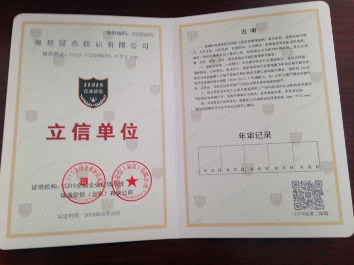 濰坊冠杰紡織有限公司,位于有“中國紡織之鄉(xiāng)”和“風(fēng)箏之都”美稱的山東濰坊。是集紡織、印染、針織、貨物進(jìn)出口和技術(shù)進(jìn)出口于一體的大型紡織企業(yè)集團(tuán)公司。