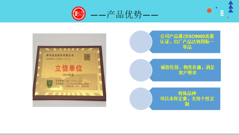 公司注重產(chǎn)品質(zhì)量和信譽,緊緊圍繞“品質(zhì)為先,持續(xù)創(chuàng)新,快速反應(yīng)”的經(jīng)營理念和“立足山東、面向浙廣、輻射全國”的戰(zhàn)略定位,以產(chǎn)品創(chuàng)新和產(chǎn)品質(zhì)量服務(wù)相結(jié)合,得到客戶的信賴,贏得了市場的青睞。產(chǎn)品供不應(yīng)求,企業(yè)和客戶形成合作共贏,共同發(fā)展的局面。