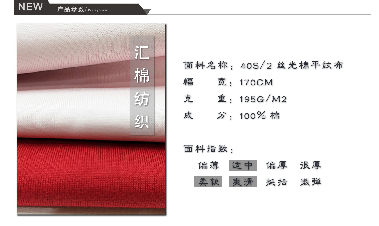 產(chǎn)品關(guān)鍵字:雙絲光棉布,平紋布,絲光棉面料,絲光棉汗布,全棉面料