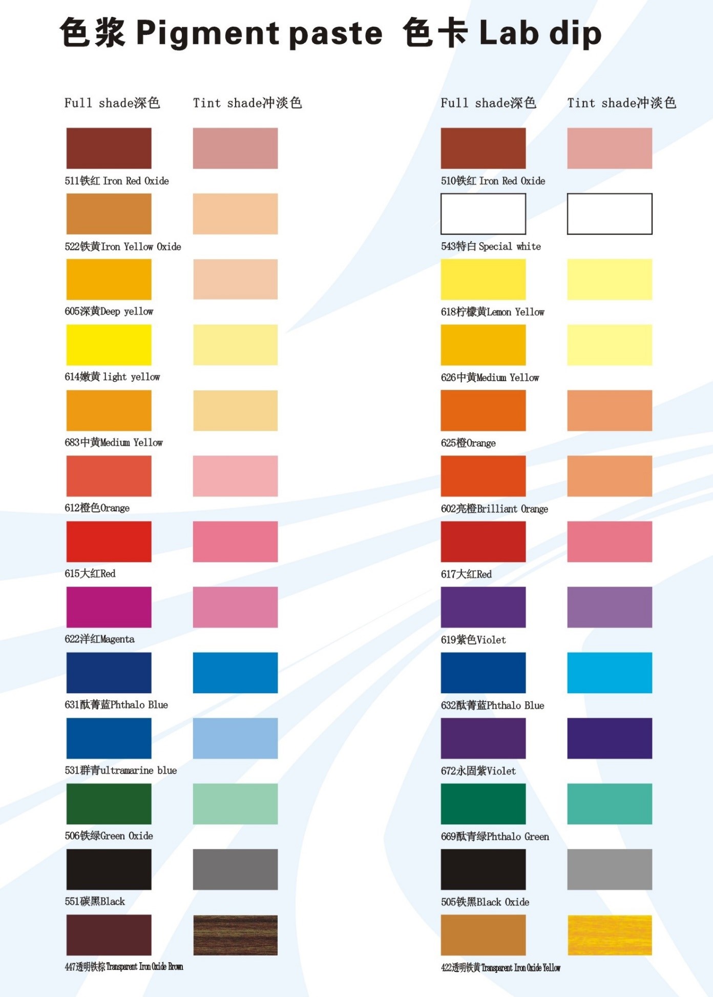 色漿是由顏料或顏料和填充料分散在漆料內(nèi)而成的半制品。以純油為膠粘劑的稱油性色漿。以樹脂漆料為膠粘劑的稱樹脂色漿。以水為介質(zhì)添加表面活性劑分散而成的顏填料漿稱為水性色漿。由于漆料種類很多,色漿種類也很多。為了使顏料等更好地分散在漆料中,往往在制造過程中,加少量的表面活性劑等。
