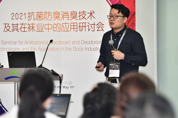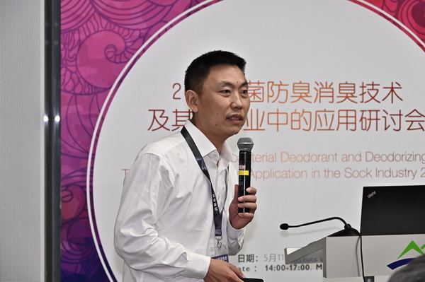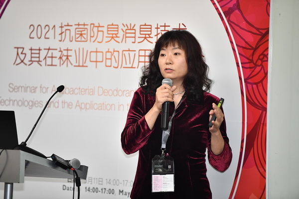 東華大學孫賓教授以《有機分子雜化型金屬系納米材料的構筑及其抗微生物功能材料的應用開發(fā)》為主題,對其研究的有機分子雜化型金屬系納米抗菌材料及其在襪業(yè)中的應用進行了介紹。而妙抗保國際(亞洲)有限公司袁芳經理則以《利用抗菌及氣味控制技術重新定義襪子產品的潔凈》為主題,對妙抗保國際(亞洲)有限公司在襪子氣味方面的研究,以及基于此開發(fā)的抗菌及氣味控制技術進行了介紹。