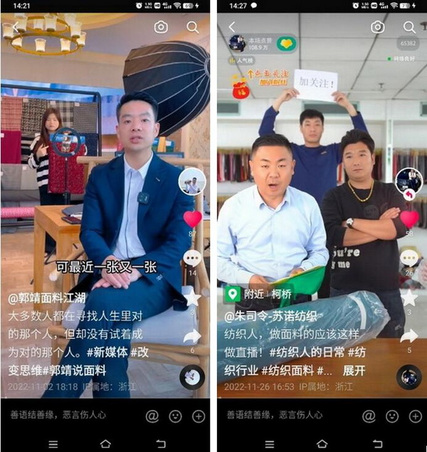 柯橋紡織抖音團發(fā)起人之一紹興柯橋天御紡織有限公司總經(jīng)理郭靖表示,公司開始運營抖音以來,線上獲客率已經(jīng)遠遠超出線下,成為工廠主要的獲客渠道。平臺不僅為公司招攬到了80噸的訂單,也吸粉了不少優(yōu)質(zhì)客戶,其中不乏高質(zhì)量的加工廠和服裝品牌公司。持續(xù)發(fā)布的小視頻使企業(yè)每天都能夠收獲超過20個詢盤。