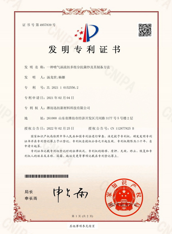 近日,由AgileTex迅紡研發(fā)團(tuán)隊(duì)完成的“一種噴氣渦流紡多組分抗菌紗及其制備方法”技術(shù)成果,喜獲國(guó)家發(fā)明專利授權(quán)。該發(fā)明解決了目前噴氣渦流紡品種單一、成紗性能受局限的問題,通過降低多組分抗菌紗的條干、重量、強(qiáng)力的變異系數(shù),大幅提升面料質(zhì)量,同時(shí)實(shí)現(xiàn)穩(wěn)定的抗菌性能。本發(fā)明最終將應(yīng)用于醫(yī)用洗手衣等產(chǎn)品的開發(fā),為醫(yī)護(hù)人員提供牢實(shí)柔軟的“安全護(hù)甲”。