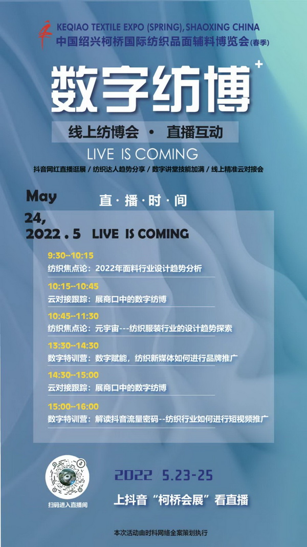 世界紡織看中國,中國紡織在柯橋。5月23-25日,2022年國內(nèi)首個專業(yè)紡織面料線下展,中國紹興柯橋國際紡織品面輔料博覽會(春季)將在紹興國際會展中心舉行。