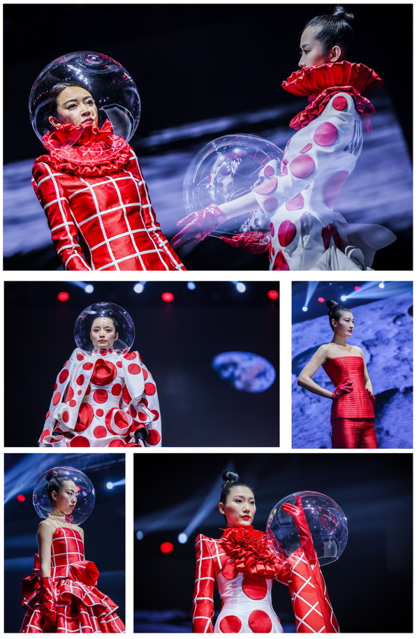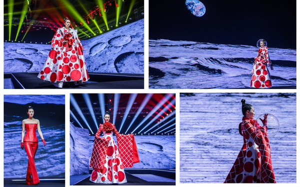 本次跨界大秀胡社光親自構(gòu)思設(shè)計主題定制服裝,設(shè)計過程中緊密結(jié)合發(fā)布會主題、兩大篇章八大類流行纖維的內(nèi)涵外延,盡顯纖維之美、纖維之魅。在纖•自然本源篇大秀中,我們看到身穿東方傳統(tǒng)服飾的少女,從巍巍青山中徐徐走來,無處不彰顯著自然之美,非遺漢繡老繡片與高定服裝的完美結(jié)合,更使悠悠纖絲貫穿古今,奔向未來。在纖•蝶變新生篇大秀中,胡社光以未來宇宙為主題--織-天宮,以“無界與共行”為設(shè)計理念,以同色系的撞色拼接設(shè)計更彰顯了一種簡約卻又富有層次的時尚之美、夢幻之美。