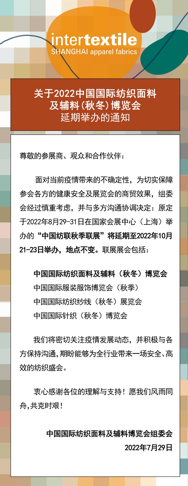 關(guān)于2022中國(guó)國(guó)際紡織面料及輔料(秋冬)博覽會(huì)延期舉辦的通知