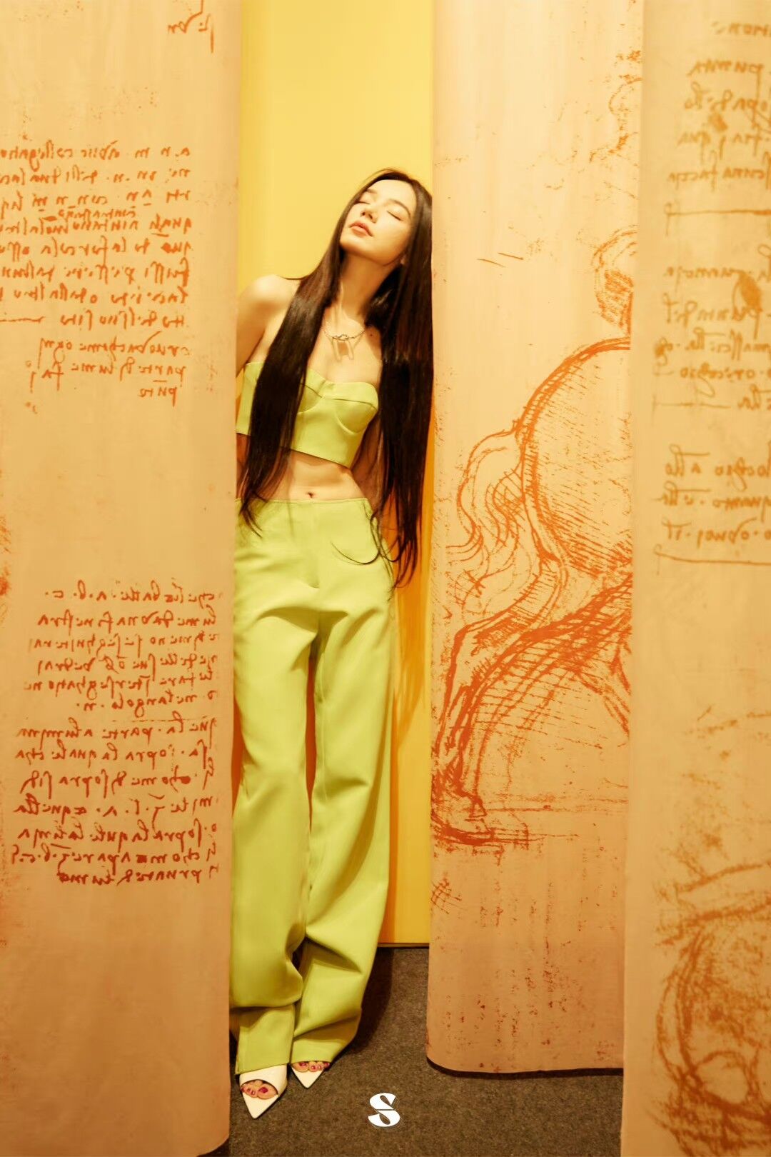 同樣選擇了亮色系套裝的還有演員代斯。抹胸上裝洋溢活力氣息,亦凸顯優(yōu)美流暢的肩頸線條;搭配高腰休閑長褲,更顯修長筆挺。醒目的檸檬亮黃傳遞出眾吸睛的飽和色調(diào),定格前衛(wèi)印象,為秋季日常型錄點綴一抹靚色。