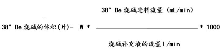 根據(jù)此燒堿補充液總量的計算值,適當(dāng)可多配制些補充液,假定此燒堿補充液的總量為W升,則如下計算配制此補充液所需38°Be燒堿的體積。