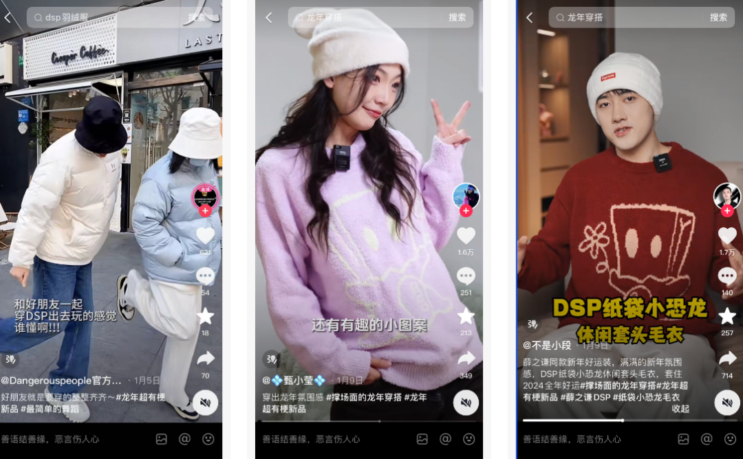 其中,DSP打通全鏈路種草,邀請@甄小瑩、@不是小段等達人展現(xiàn)龍年新穿搭,并在短視頻中分享「DSP紙袋小恐龍休閑套頭毛衣」新品,通過優(yōu)質(zhì)內(nèi)容營造滿滿的新年氛圍感?;顒悠陂g,隨著#撐場面的龍年穿搭 話題登上抖音熱點總榜TOP 5,DSP新品覆蓋到更多興趣用戶,通過直播加推、優(yōu)惠券疊加等玩法,此款新品訂單量破1300,貨架GMV占比超過37%。