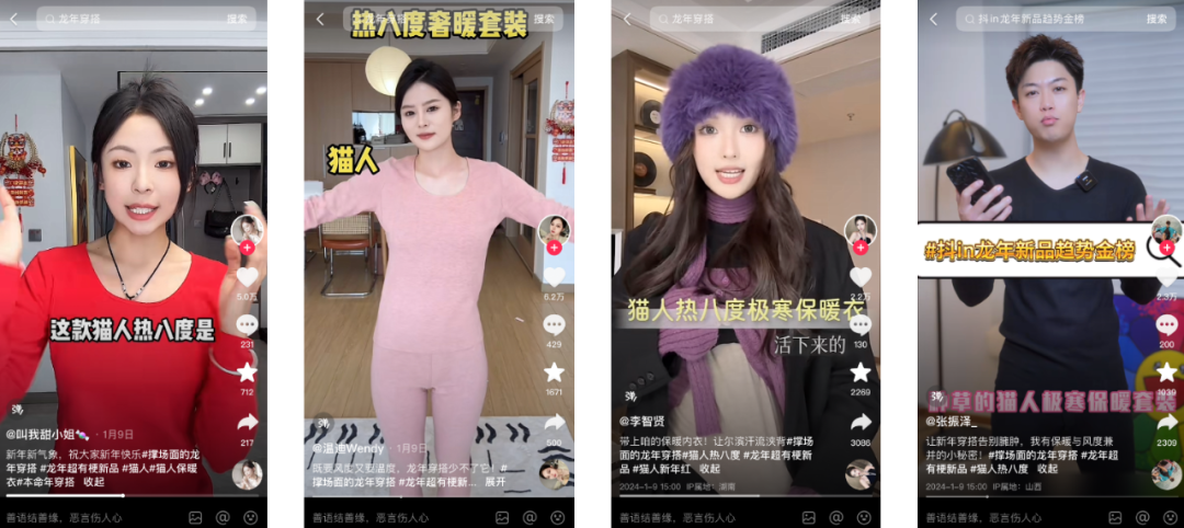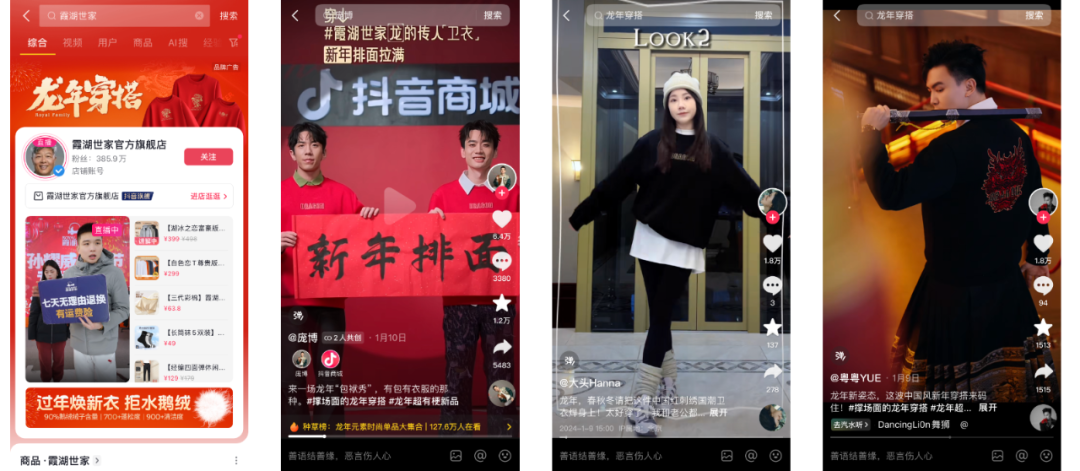 「抖in新風潮·龍年超有?!够顒由暇€#撐場面的龍年穿搭和#龍年超有梗新品兩大話題,引發(fā)消費者的討論和關(guān)注。明星、達人緊跟熱點,分享龍年新穿搭,展示了羽絨服、大衣、毛針織衫、衛(wèi)衣、保暖內(nèi)衣等不同品類服飾品牌的潮流態(tài)度。截至目前,相關(guān)話題的總播放量突破3億。