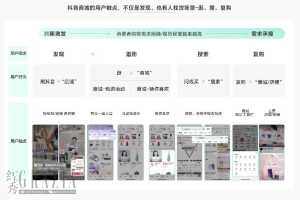 其次,多元化觸點(diǎn)覆蓋豐富消費(fèi)場(chǎng)景,助力商家完成長(zhǎng)效經(jīng)營(yíng)。消費(fèi)者的購(gòu)買路徑通常遵循“了解-吸引-問(wèn)詢-購(gòu)買-復(fù)購(gòu)”的5A鏈路。其中前兩個(gè)環(huán)節(jié)至關(guān)重要,是所有后續(xù)發(fā)展的基礎(chǔ),尤其在消費(fèi)者注意力分散的當(dāng)下。抖音商城在這兩個(gè)環(huán)節(jié)具備天然優(yōu)勢(shì),興趣內(nèi)容、猜你喜歡、搜索承接等基礎(chǔ)設(shè)施充分覆蓋了發(fā)現(xiàn)、逛、搜、復(fù)購(gòu)等一系列消費(fèi)場(chǎng)景。這一整套組合拳使得品牌在抖音陣地的長(zhǎng)期繁榮成為可能。