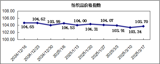 “中國·柯橋紡織指數(shù)” 20250317期紡織品價格指數(shù)收報于103.70點,環(huán)比上漲0.35%,較年初下跌0.79%,同比下跌1.10%。