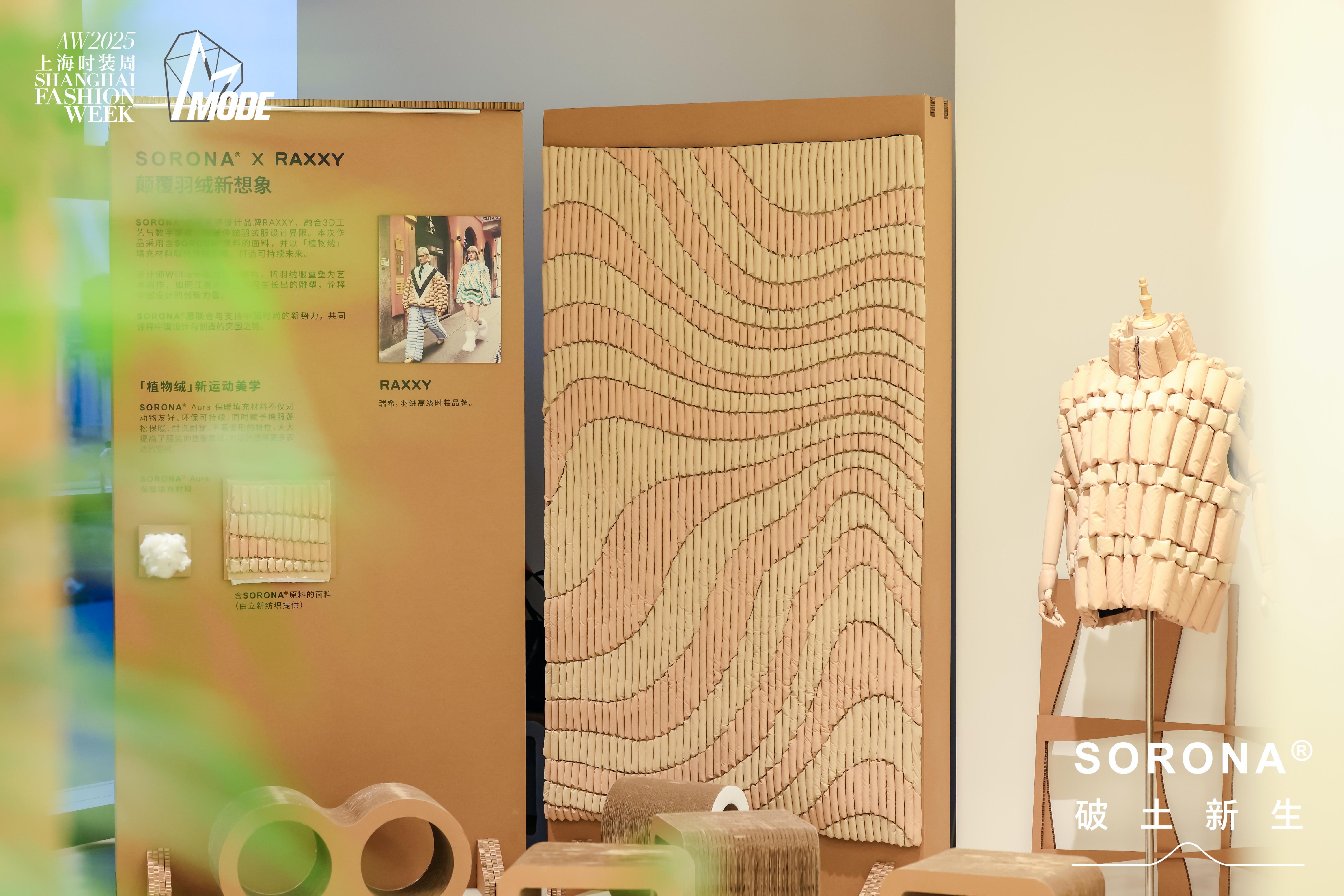竹海中,SORONA®聚合物的生產(chǎn)過程、性能組合、品牌認(rèn)證體系與吊牌系列等信息依序展示,SORONA®與傳越新材、群德紡織、自然化纖三位材料端合作伙伴,以及與高級時裝羽絨品牌RAXXY的創(chuàng)意聯(lián)創(chuàng),也展現(xiàn)了從原材料的甄選、到織物的塑形、再到設(shè)計師筆下的靈感躍動,每一道工序如竹節(jié)般承前啟后、遞進蛻變的產(chǎn)業(yè)鏈進階生態(tài)。SORONA®為品牌客戶提供的一站式應(yīng)用技術(shù)解決方案的“成熟態(tài)”,也就此落地有聲,如「破竹之勢」,開啟從自然生長到共生未來的非凡旅程。而這段旅程在本屆MODE展的起點,或許從1樓入口處設(shè)計師集合展示區(qū)展示的RAXXY品牌令人一眼驚艷的作品,就已經(jīng)開始。