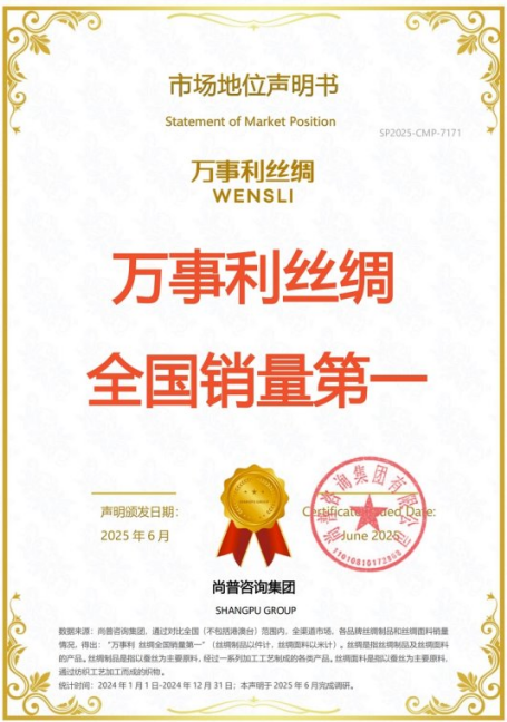 2025年6月,尚普咨詢(xún)集團(tuán)對(duì)絲綢制品及絲綢面料開(kāi)展了專(zhuān)項(xiàng)研究,從行業(yè)趨勢(shì)、競(jìng)爭(zhēng)格局、企業(yè)經(jīng)營(yíng)等方面針對(duì)行業(yè)進(jìn)行了全面、系統(tǒng)、廣泛而深入的調(diào)研,以呈現(xiàn)萬(wàn)事利在行業(yè)中的市場(chǎng)地位。此次萬(wàn)事利榮獲尚普咨詢(xún)【萬(wàn)事利 絲綢全國(guó)銷(xiāo)量第一】聲明,不僅確立了萬(wàn)事利在行業(yè)內(nèi)的標(biāo)桿地位,彰顯了中國(guó)絲綢企業(yè)的品牌影響力與引領(lǐng)作用,也充分印證了傳統(tǒng)絲綢產(chǎn)業(yè)在創(chuàng)新驅(qū)動(dòng)下煥發(fā)出的蓬勃生機(jī)。
