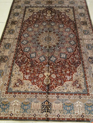 圖片產(chǎn)品說(shuō)明:品名:天然手工編織絲毯(真絲地毯) 品牌:億絲東方絲毯 編號(hào):T04592 尺寸:4×6英尺 色調(diào):紅色加米色系 此圖案為傳統(tǒng)波斯紋樣,經(jīng)典低調(diào)不失奢華。適合于各種裝修風(fēng)格